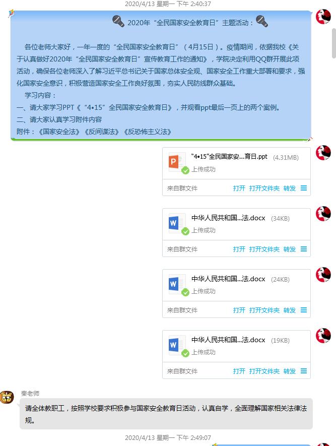 4月13日,疫情期间,威廉希尔中国官网利用QQ群举办了关于全民国家安全教育日的主题活动,党总支书记秦少军担任主讲人,全院教职工参加了活动。