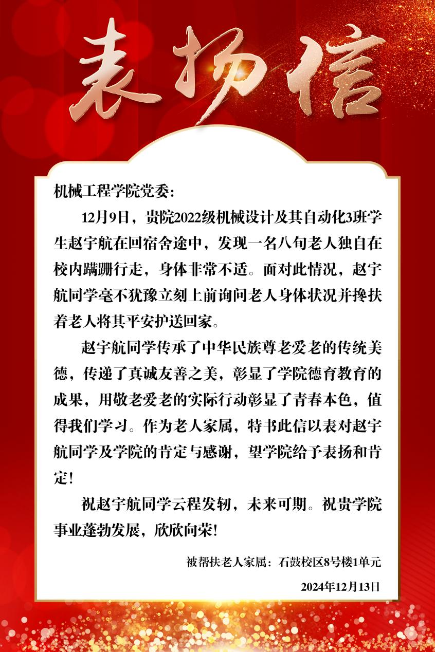 近日,威廉希尔中国官网收到了一封表扬信,信中受助老人家属对2022级机械设计及其自动化3班赵宇航同学尊老爱老,帮助突发身体不适老人的良好品德给予了表扬。