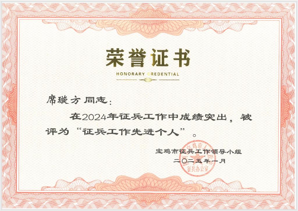 **来源**:williamhill官网,校园动态,“席璇方同志荣获2024年宝鸡市“征兵工作先进个人”荣誉称号”,发布日期:2025年02月19日 15:28
